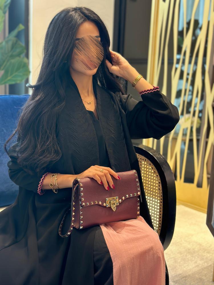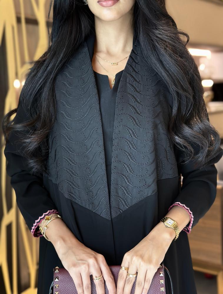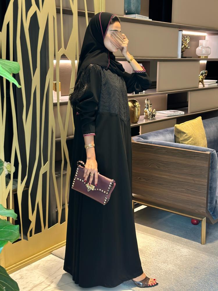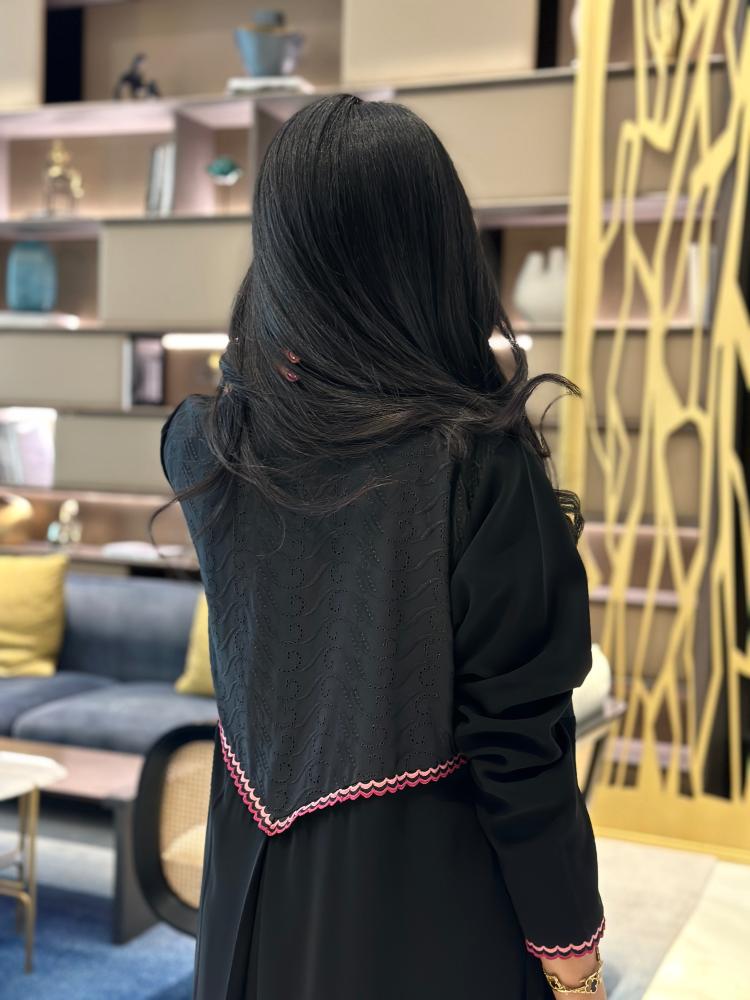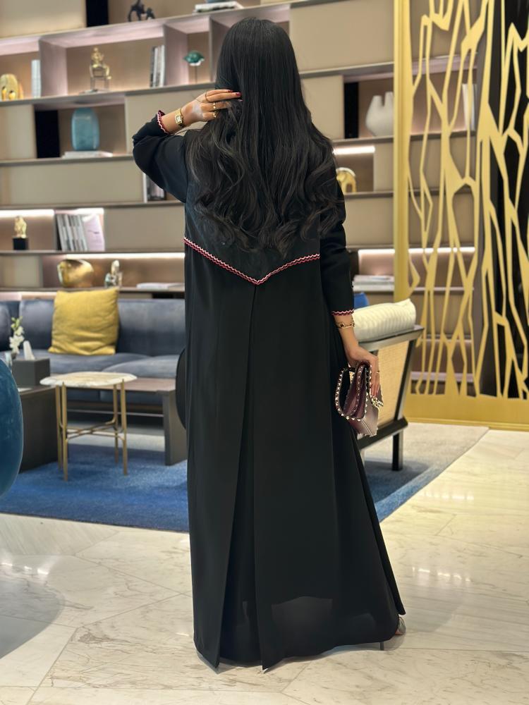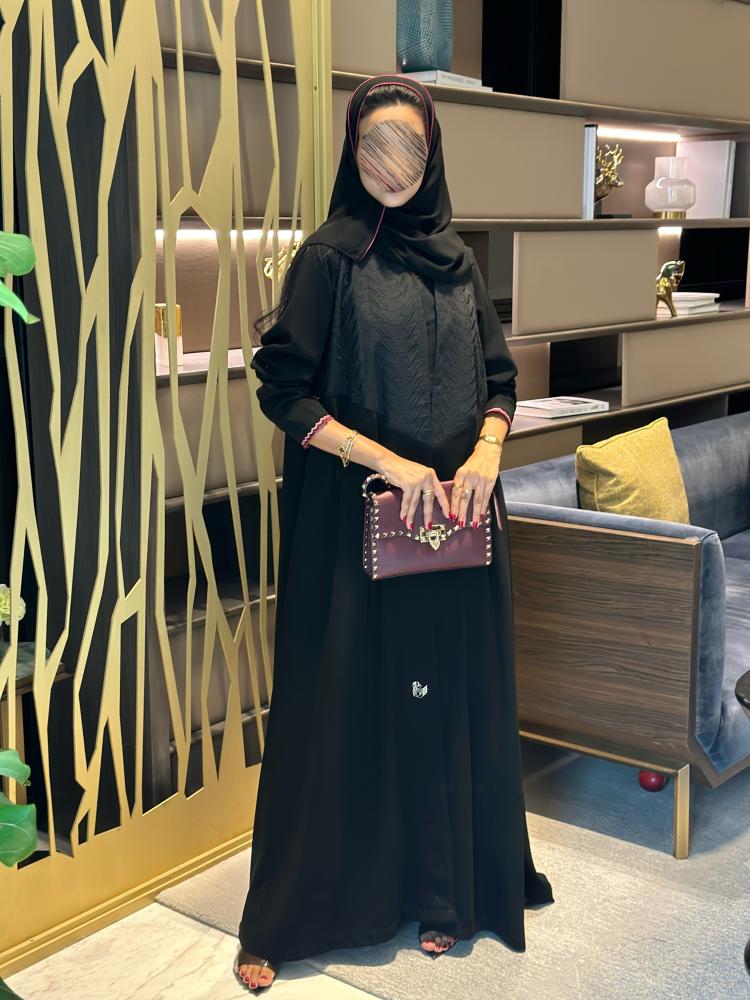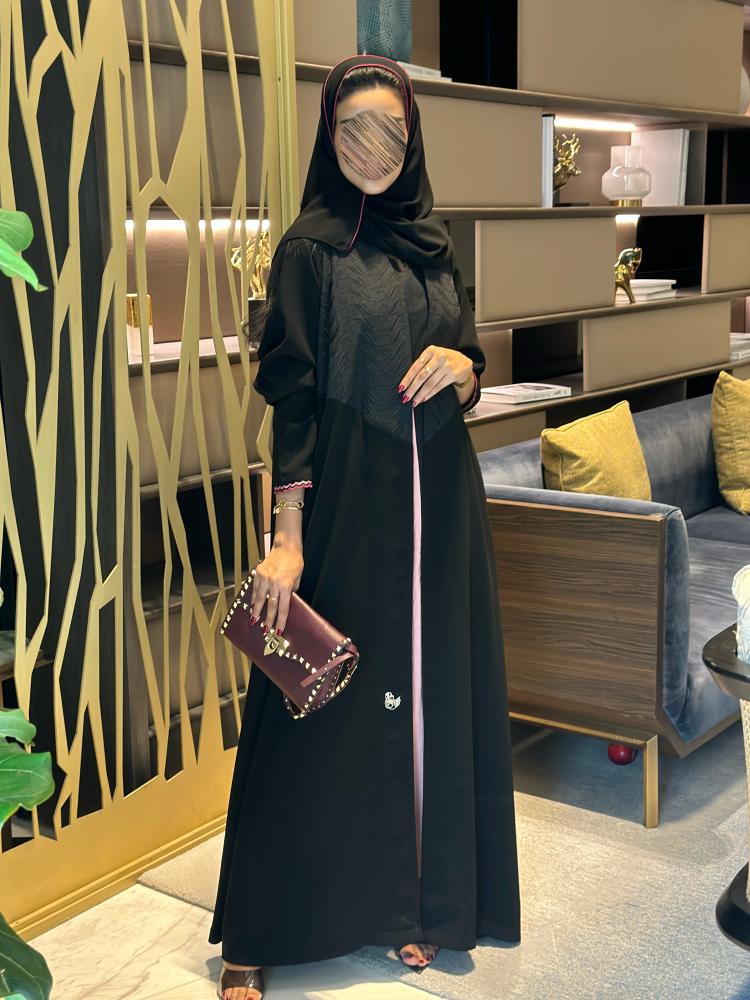 القماش : كريب اسود كوري صيفي بارد مع ركامه اسود وكسره بالخلف